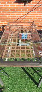 Zware smeedijzeren tafel met glazen blad. Ook 6 bijhorende smeedijzeren stoelen en kleinere tafel in zelfde materiaal met glazen blad. Grote tafel met 6 stoelen en kleinere tafel afzonderlijk ook te k