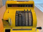 Ik vermoed dat de kassa alvast een 80 jaar oud is. Ooit in geel deels overschilderd geweest. Zwaar gewicht en staat op een houte plaat. Heeft ooit tic