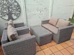 Set bristol turi in alu/r3mm wicker bruin : 1 x sofa 2-zit 130 x 75 x 65 cm 2 x sofa 1-zit 70 x 75 x 65 cm 1 x koffietafel 105 x 56 x 44 cm (wicker lichtjes geschonden) met glazen bovenplaat met bijho