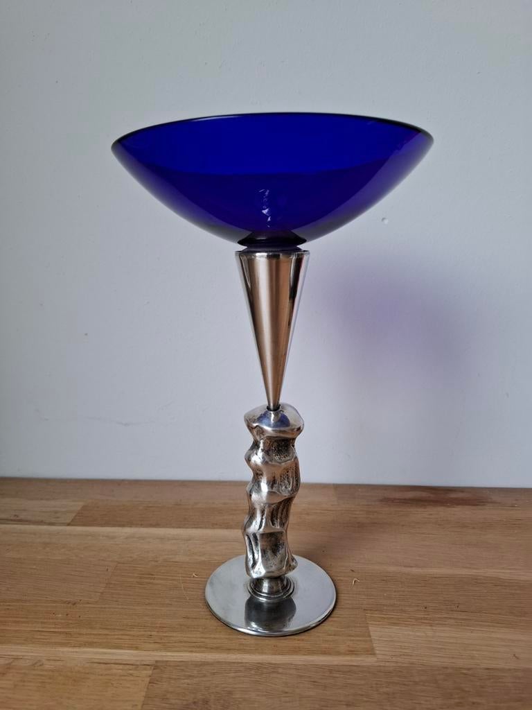 Prachtig vormgegeven schaal uit kobaltblauw glas op zwaar verzilverde, organisch vormgegeven metalen voet. Deze blikvanger is ontworpen door de vermaarde in italië werkzame architect david palterer in
