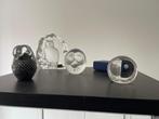 Vier verschillende beelden in glas van uilen. Prijs van 50 tot 100 euro per stuk.