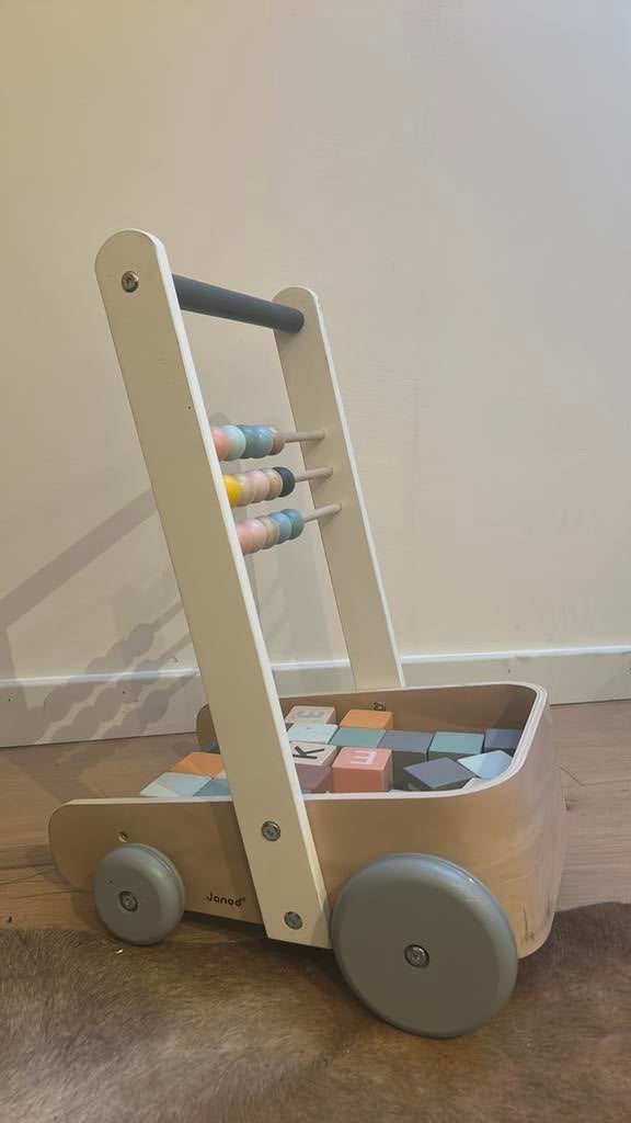 Janod loopwagentje met 20 houten letterblokjes. Amper gebruikt. Nieuwprijs online tussen €63 en €78 euro. Nette staat! Afhalen in erpe-mere of zwalm
