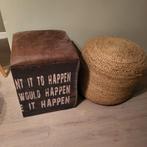 Goede staat rieten poef hoogte 36, doorsnee 42 cm, houten zit met deksel hoogte 44 cm en doorsnee 34. Per stuk 7 euro, voor 2 samen 10