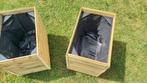 2 stevig gemaakte plantenbakken, de binnenzijde is afgewerkt met plastiek en daarboven worteldoek, op de poten is trespa gekleefd, zodat ze geen vocht opnemen. Afmetingen, br : 50cm , d : 33 , h: 51 .