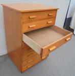 Mooie vintage schoolkast met hele diepe laden. Typisch jaren 60 van de vorige eeuw. Uitgevoerd in beukenhout mooie warme kleur. Heeft 8 hele grote platte laden. ( Verdeling kan eruit ) ideaal voor pap