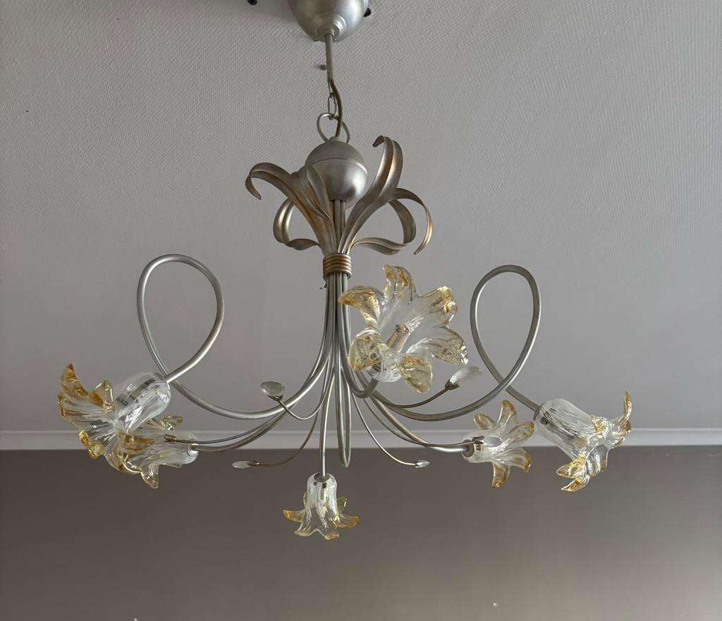 Heel mooie luster met lelie bloemen in glas,met ledlampjes inbegrepen.nieuw prijs 349€ prijs op foto.glazen bloemen kunnen er af voor af te wassen.weg wegens verhuis.
