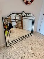 Prachtige vintage belgische spiegel in art deco stijl. Fijn geslepen details in de rand met zwarte omlijsting maken van deze spiegel een pronkstuk. Aa