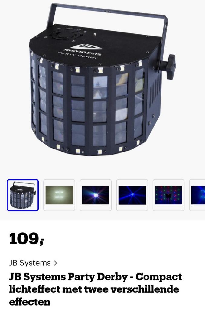 Prijs is voor 2 stuks jb-systems party derby 2 effecten in 1 derby/strobe werkt op auto/sound/dmx ik kocht deze voor 109€ per stuk nu 99€ voor 2 stuks enkel nu en dan thuis gebruiktZo goed als nieuw Ophalen