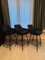 Te koop: 3 moderne barkrukken in donker (zwart/antraciet) fluweelachtige stof met zwart metalen onderstel. De stoelen zitten comfo