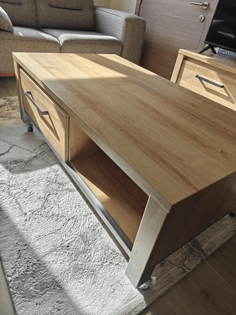 Mooi en stevig tv-meubel in houtlook goed onderhouden en in goede staat 40 cm x 150 cm x 50 cm stevige salontafel in houtlook voorzien van wieltjes, waardoor hij makkelijk te verplaatsen is. In goede