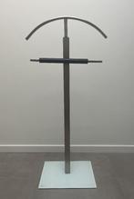 Metalen, moderne dressboy met melkglazen voet. Afmetingen: totale hoogte is 1m13, de totale breedte is 51 cm. De breedte waarop je een broek kan hangen is 44 cm. De melkglazen voet bestaat uit tempere