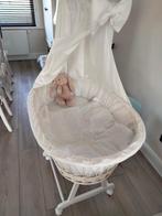 Mooie wieg in riet met hout. Kleur wit. Op wieltjes. Met afneembare hemel en alles kan af om te wassen. Dubbele stevige matras. In