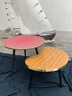 2 bijzettafeltjes uit de jaren ‘50: ronde tafeltje: 40cm doorsnede, 39cm hoogte met gelakt metalen onderstel (tripod). Bovenafwerk
