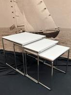 Mimi-set van brabantia bestaande uit 3 tafeltjes, jaren ‘70. Uitvoering met omkeerbare bladen, wit/oranje. De oranje zijde heeft d