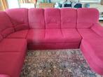 Grote rode zetel met bergruimte onder de chaise longue. Middenstuk uittrekbaar, zie foto gebruikt, maar kan nog gerust enkele jare