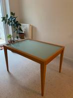 Stijlvolle en stevige eettafel met matglazen blad en houten kader. Compact in gesloten stand (120 x 90 x 76 cm) en uitschuifbaar tot 240 cm – geschikt voor 4 tot 10 personen. De tafel is in zeer goede