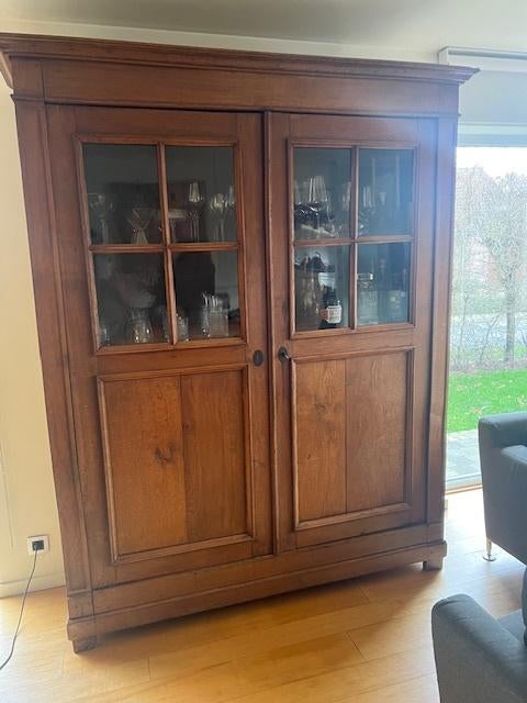 Mooie vintage eiken vitrinekast in goede staat afmetingen: 210 cm (hoogte) x 164 cm (breedte) x 48 cm (diepte) enkel afhalen (bestelwagen of remorque is nodig) moet dringend weg omdat nieuwe (kleinere