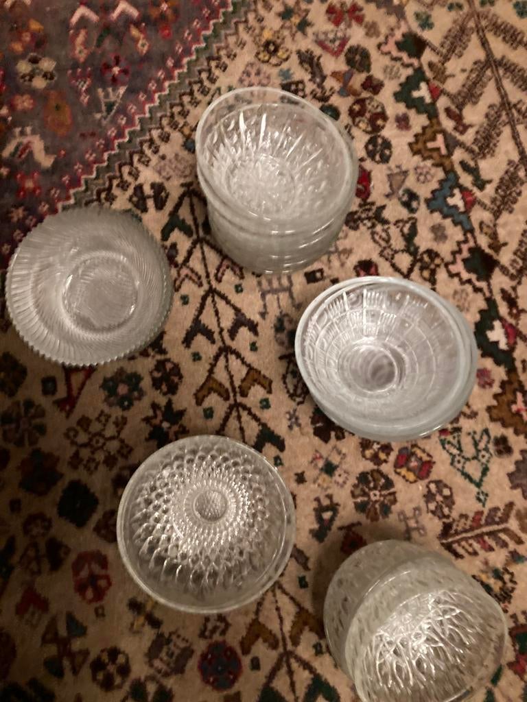 5 verschillende designs glazen potjes voor pudding, bolletje ijs,… in totaliteit 23 potjes onbeschadigd