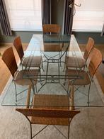 Glazen eettafel 200cm x 100cm x 73cm op metalen onderstel. + 6 Stoelen (2 met leuningen) (1 gewone stoel beschadigd) totaalprijs 4