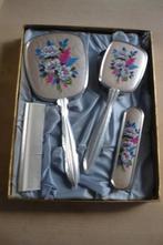 Lavabo set . Borstel , kam , spiegel , kleding borstel . Zeer mooie tekening in kleur .
