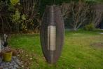 Metalen lantaarn. Hangt op aan een ketting. Kaars staat op een metalen schoteltje dat in de lantaarn hangt en er langs boven of onder kan uit gehaald