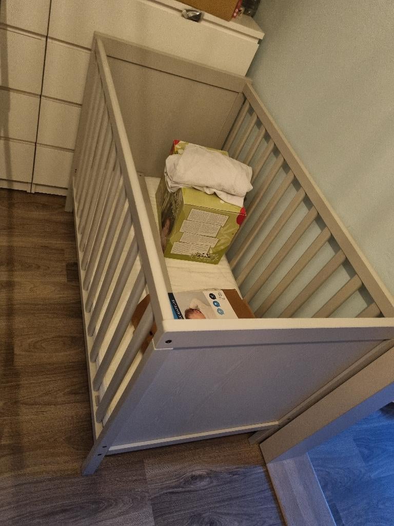 Babybed met toebehoren en ook lat bij om er een bed van te maken dat ze zelf erin en uit kunnen. En ook commode deze is bijna niet gebruikt. Allebei als nieuw is niets van gebruik sporen aan te zien. Zo goed als nieuw Ophalen