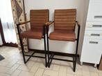 Twee moderne mooie barkrukken in cognac kleurig leder. Breedte:56 cm hoogte116 cm zithoogte:77 cm hoogte armleuning: 93 cm diepte: