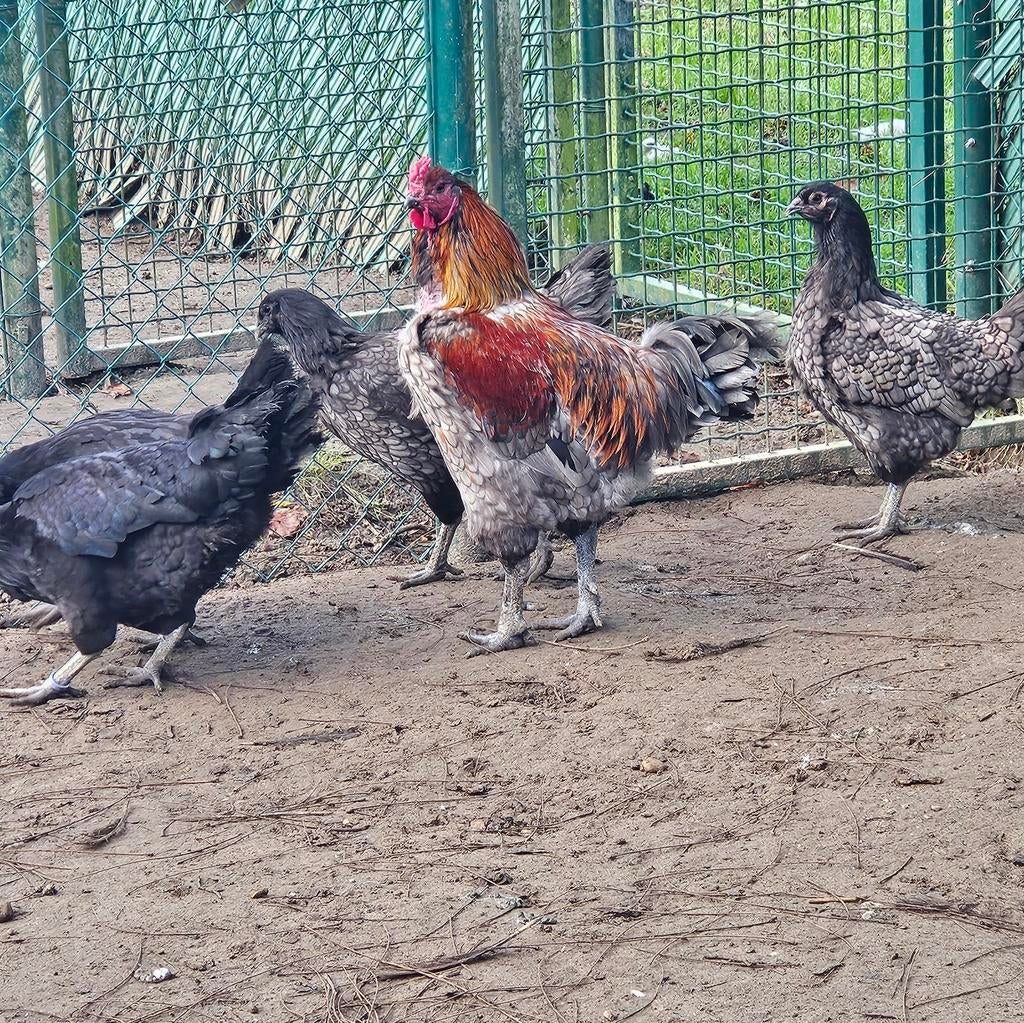 Blauw goudhalzige haan brugse vechter van 2024. Laatste beschikbare dier. Werd gebruikt als kweekhaan in 2025. Zeer goed type!