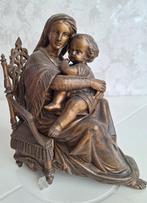 Prachtig antiek beeld van moeder en kind. Het beeld is in twee delen gegoten. De moeder en kind zijn in één stuk gegoten, de stoel