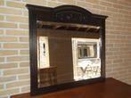 Zwart gelakte eiken spiegel met zeer mooie patine. Spiegel in geslepen glas met minieme ouderdomssporen. Afmetingen: breedte bovenaan 99 cm, hoogte middenboog inbegrepen 87,5 cm. Klaar om op te hangen