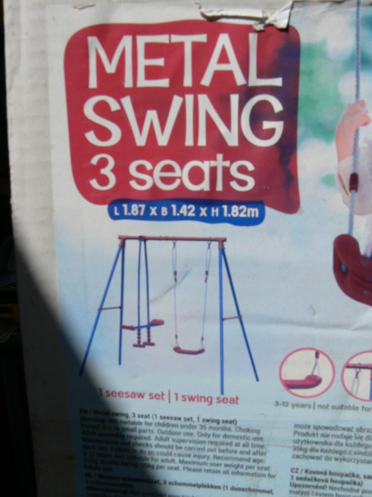 Nieuw metaal kinderschommeltje nooit in elkaar gezet 3 zitjes lengte 1,87 breedte 1,42 hoogte 1,82