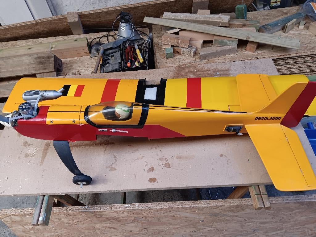 Rc laagdekker vliegtuig met servo's en een o.s. Max sf 2 takt motor. Ik denk een 6,5cc. Is moeilijk te zien. Spanwijdte is 1m30. Hij is nog in redelijk goede staat. De motor ziet er nog perfect ui
