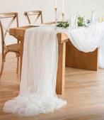 Witte mesh transparante tafelloper (zonder bloemen) lengte: 10 meter breedte: 160 centimeter 1x gebruikt voor huwelijk (ook mogelijk voor andere feestelijke gelegenheden) 2 stuks beschikbaar €6,