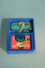 Pennendoos met balpen en uurwerk van sunparks de haan, aandenken “employe of the month”. (1998) Balpen werkt nog, uurwerk heeft n