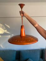 Hanglamp van geperst plaatstaal, oranje gelakt, in de stijl van louis kalff voor philips, van haute éditeur, belgië circa 1960. H