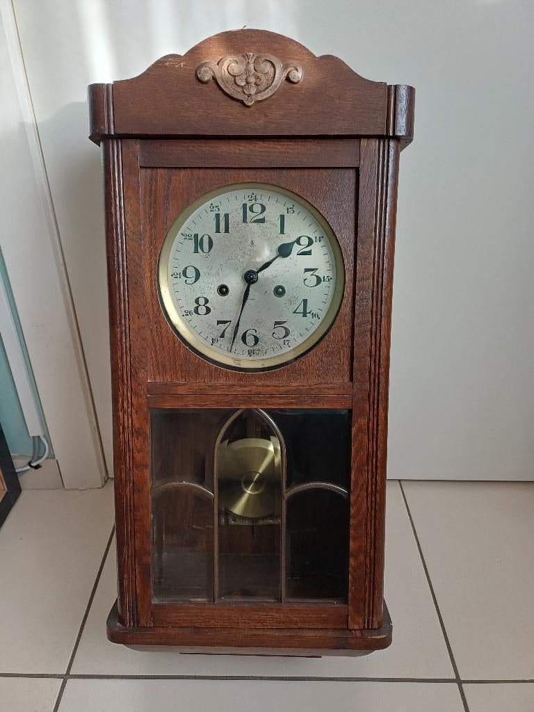 Oude antiek werkende hangklok. Inclusief sleutel. Heb deze = 58x30x17. Bieden vanaf 50 € laagste prijs. Onder de 50 gaat ze niet weg. Cash afhalen regio herent (vlaams-brabant)