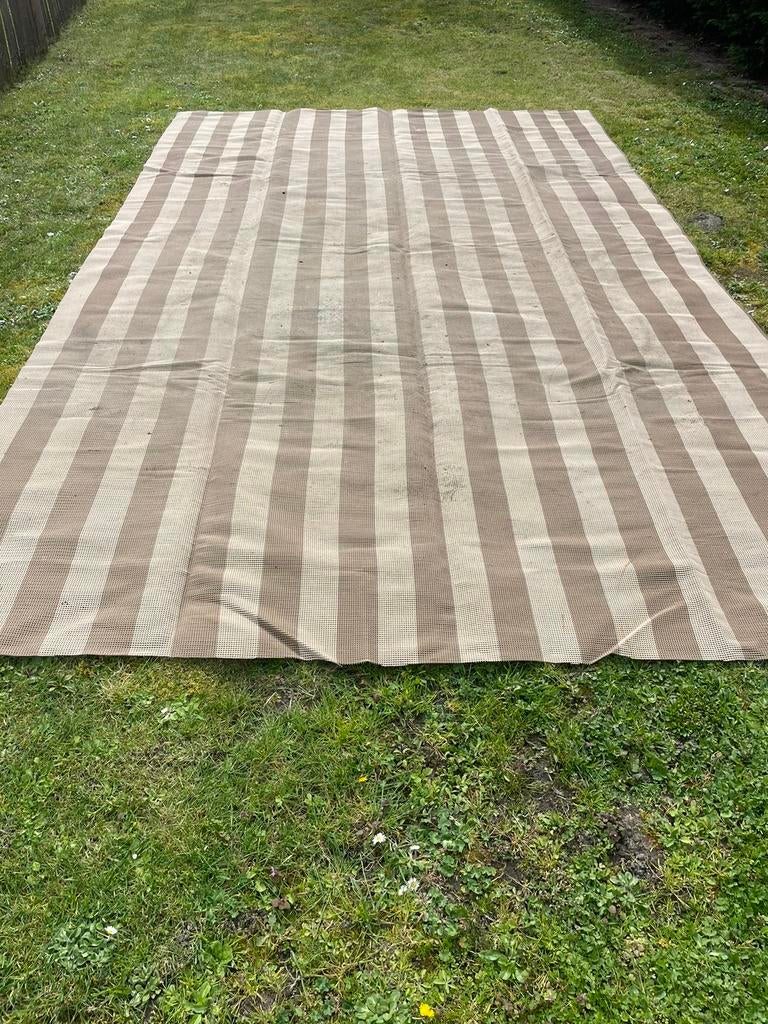 Tenttapijt in goede staat. Hier en daar een gaatje in maar zeker nog deftig afmetingen zijn 4m x 2,5m