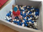 Ballenbad is in prima staat, nauwelijks gebruikt. Er zijn geen vlekken ofzo op. 110X110 en 38 hoog de randen zijn van mousse, dus zacht als het kindje valt. 55 Euro 3,5 grote zakken ballen zijn inbegr