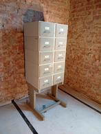 Vintage metalen dossierkast op verhoog. Modulair op te stellen, "verdiepen" per 2 horizontale lades. 10 Lades met per la