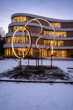 Een moderne, sculpturale lichtinstallatie van cortenstaal,
