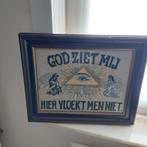 Kader .genaaid met fijne steekjes opschrift, god ziet mij hier vloekt men niet.er zit een glas voor het doek kan omhoog gehangen worden graag ook mijn andere zoekertjes bekijken.