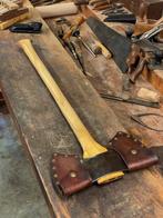 Dit is een amerikaanse dubbelbit bijl van het merk true temper (type flint edge) met handgemaakte essen steel en handgemaakte hoes uit natuurlijk gelooid tuigleer. De wig is een combinatie van acacia