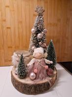 Kerstdecoratie, mag weg wegens teveel deco. Met theelichthouder. Hoogte ongeveer 32cm, diameter houten plateau ongeveer 20cm. Opha
