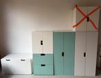 Stuva kastencombinatie van links naar rechts: - bak 90 breed x 51 diep - kast met schuiven: 128 hoog x 51 diep x 60 breed - groene kast 2 deuren: 128 hoog x 51 diep x 60 breed - witte kast 2 deuren en