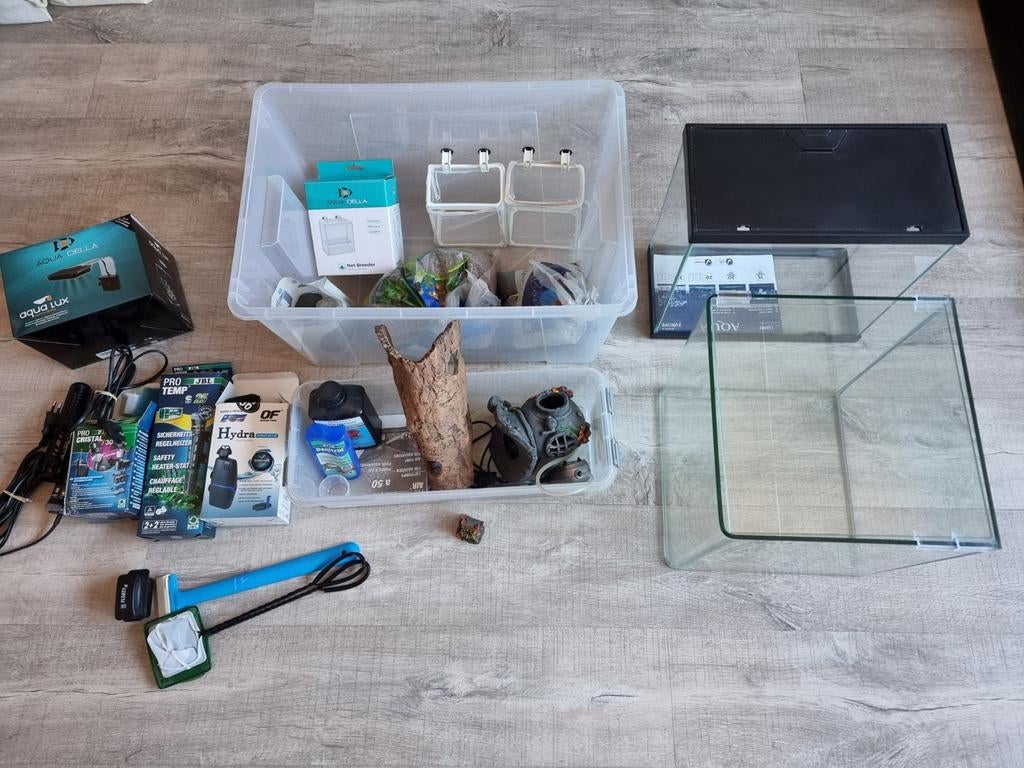 2 kleine aquaria waaronder 1 cube 30l met veel toebehoren zoals verlichting, filter, verwarming, decoratie, ... 5 Maanden gebruikt, alles netjes onderhouden graag alles tesamen ophalen