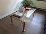 Mooie glazen salontafel met goudkleurige metalen frame. Heeft een mooi zuildetail aan de poten. Lichte gebruikssporen (zie foto
