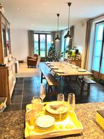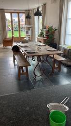 Eikenhouten tafel met stalen sierframe en authentiek tafelblad voor 8 personene. Nieuwprijs was rond de 2500€. Het tafelblad
