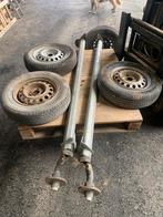 2 assen + 4 wielen voor auto remorque tekoop. Assen en wielen zijn nog als nieuw, zijn nog nooit gebruikt of gemonteerd geweest. L