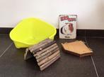 Toilet, houten brugje, extra platform om in de kooi te bevestigen en een metalen bord.