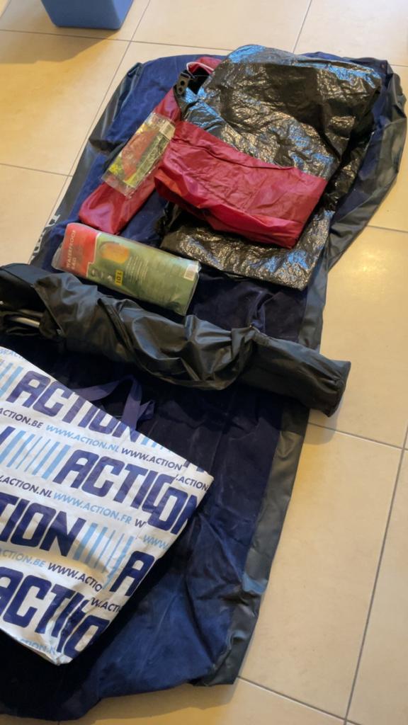 Tent, waterproof bag, opblaasbare matras. Slechts 1x gebruikt. Geen koerierdiensten, ophalen te genk. Update: opblaasbare matras niet meer beschikbaar.